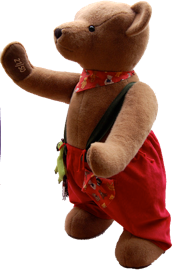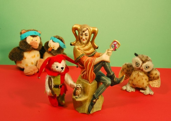 Unser Mini ist von Teddy Hermann (Design: Traudel Mischner-Hermann) und trägt ein grün-rotes Narrenkostüm mit Schnabelschuhen und Narrenkappe. In seiner Hand hält er einen Filzspiegel; seine Freunde sind von Steiff (Eule rechts) und xxx (Eulenpaar links(. Die Holzfigur gehört zur Sammlung Fellberg. Bruno ist bekannt.....