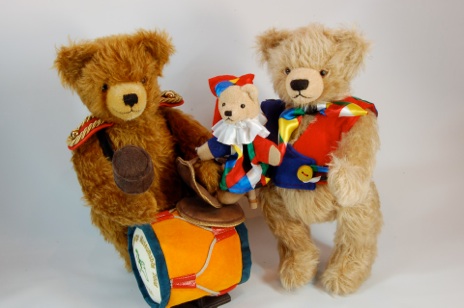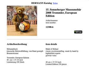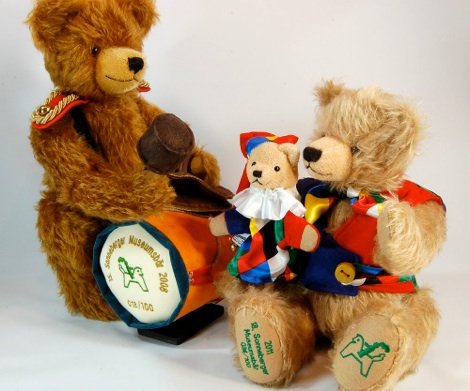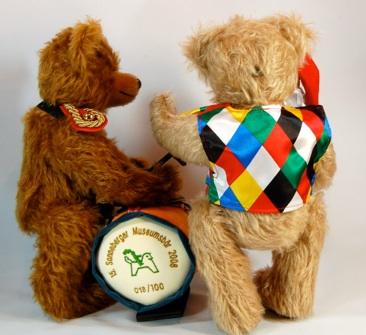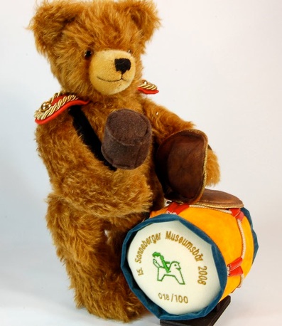 Der Trommler, trommelt und trommelt... was seine Trommel und die Epauletten hergeben. Der 15. Sonneberger Museumsbär ist ca. 38 cm groß und erinnert an eine Figur aus der berühmten „Kirmes“ im Sonneberger Spielzeugmuseum.
