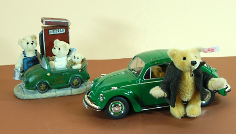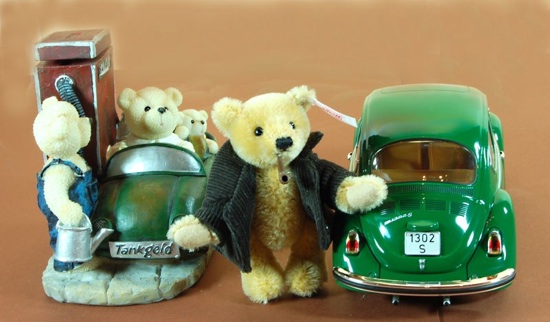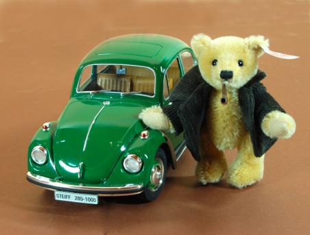 Das Set "VW-Käfer" umfasst eine maßstabsgetreue 1:18 Nachbildung des VW-Käfer sowie den original Steiffbären "Wolfgang" mit Cordjacke und Pfeife.