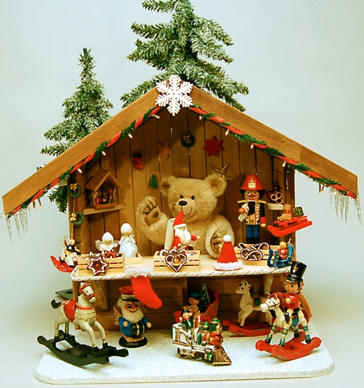 Der Weihnachtsstand ist aus echtem Holz stabil von Helenas Schwiegervater gebaut und die Lichterkette gibt auch, wenn es dunkel wird, den Bären Licht zum Betrachten des vielen wunderschönen Spielzeugs.