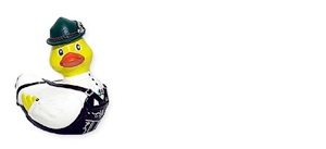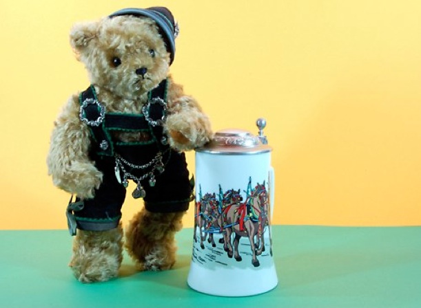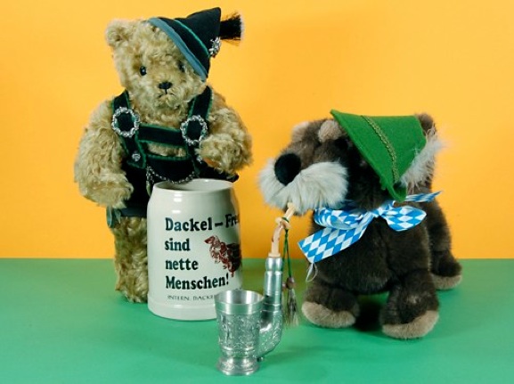 Er zeigt seine Nummer 342 aus einer Auflage von 500 Exemplaren auf seiner Pfote und trägt eine tolle Latzhose aus Leder mit Charivari und Trachtenhut mit Gamsbart- ein echte Bayer!