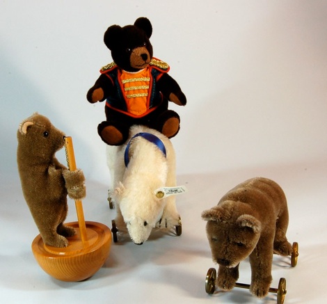 Der Zirkusdirektor aus Brunos Bärenmuseum hat einige zu tun. Hier versucht er, unsere Tanzbären zu einem kleinen Bärentänzchen zu animieren. Aber bei uns geht das alles freiwillig und ohne Zwang zu und den Steiff-Bären macht es auch riesig Spaß.